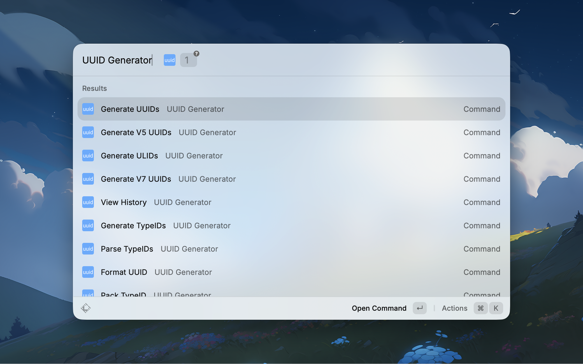 写代码或测试 API 的时候时不时需要一个 UUID。以前还要去网站上生成,现在直接在 Raycast 里一键生成并复制到剪贴板,支持 v4 等多种格式,简单高效。