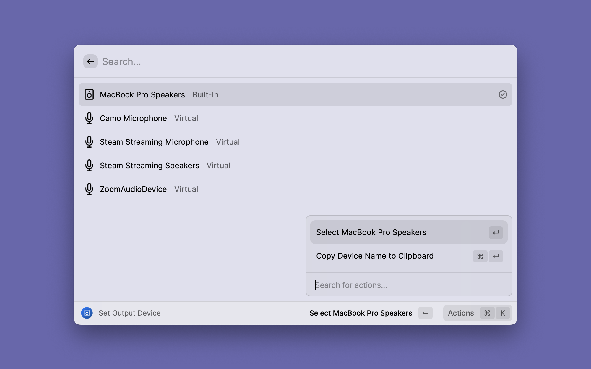 在耳机、外接音箱和 Mac 内置扬声器之间频繁切换是日常操作。以前要去系统设置里点好几下,现在 Raycast 里一个命令就能切换音频输出设备,开会前切麦克风也很方便。