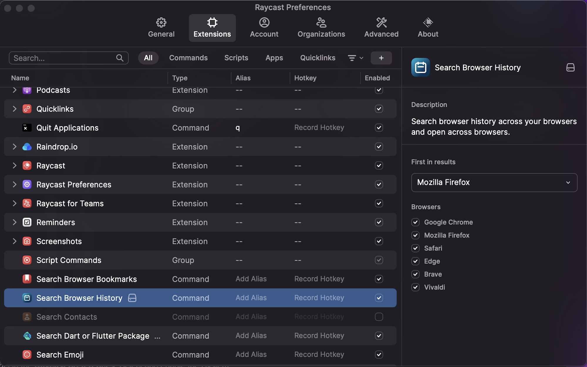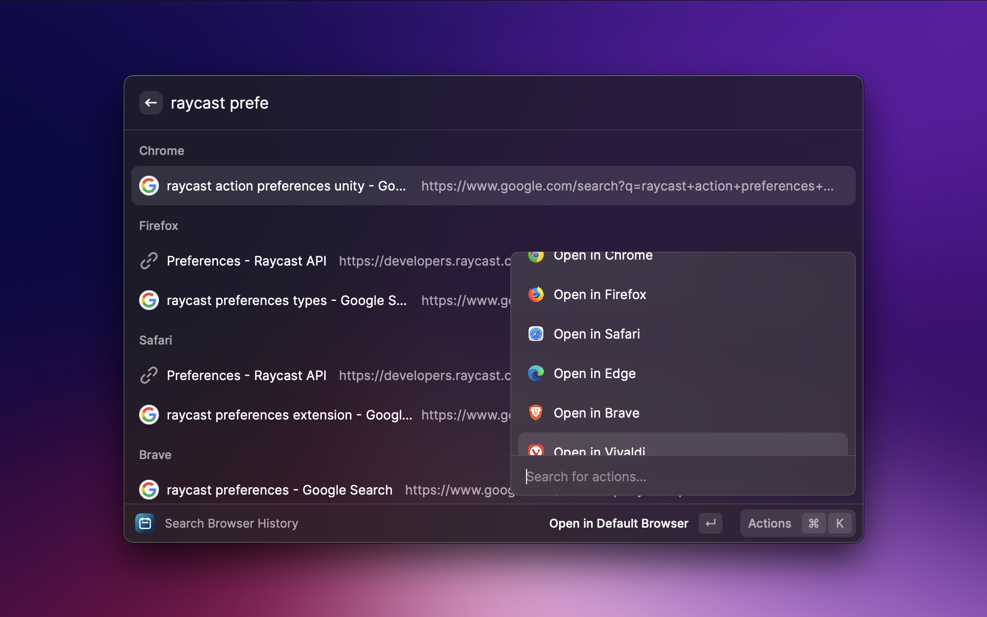 之前看过一个网页但忘了收藏,打开浏览器翻历史记录太慢了。这个插件可以跨浏览器搜索历史记录,支持 Chrome、Arc、Safari 等主流浏览器。输入关键词就能快速定位之前访问过的页面,用 Raycast 搜索比在浏览器里翻要高效得多。