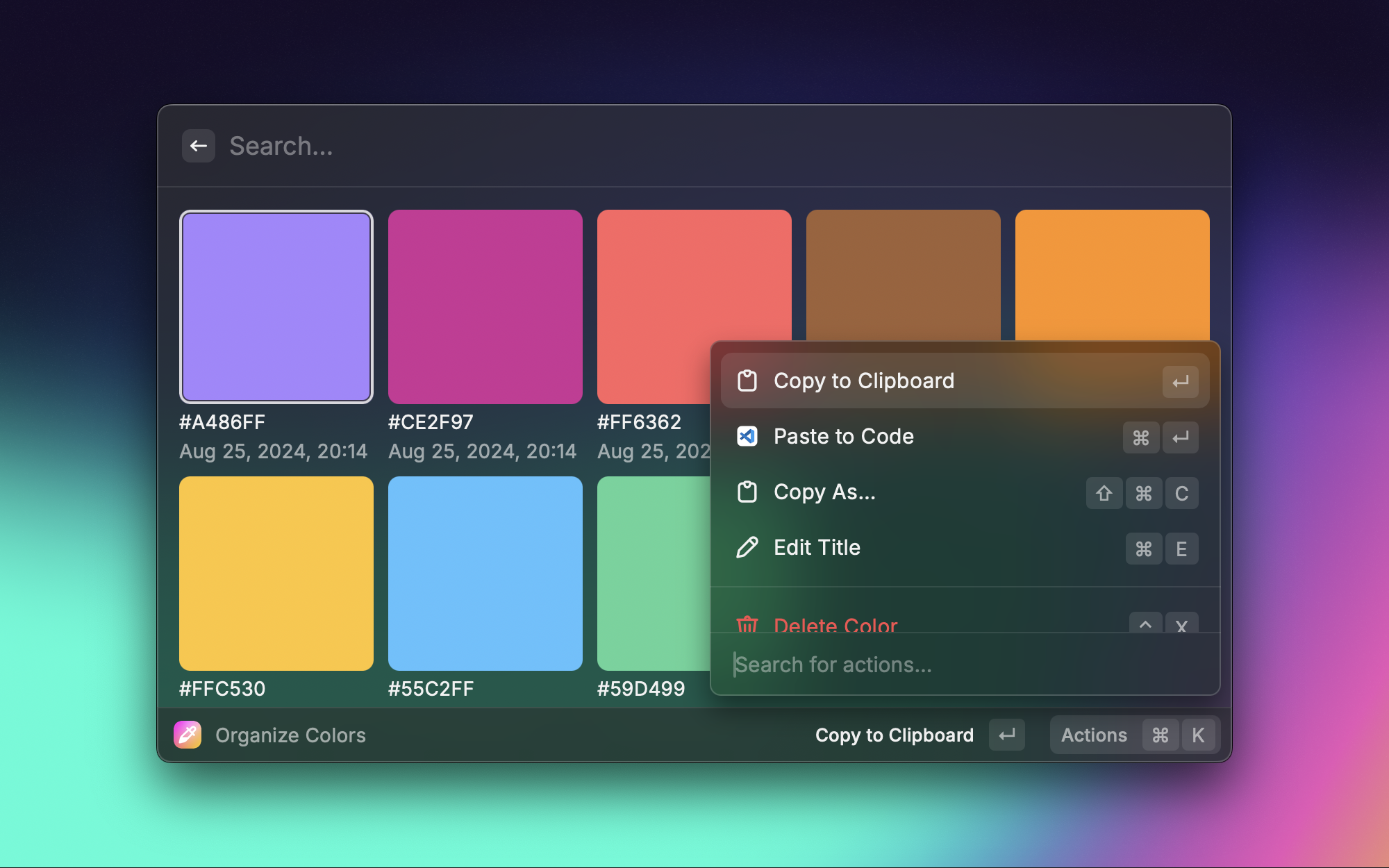 做前端或者调整博客样式的时候,经常需要从屏幕上取色。Color Picker 调出系统取色器,吸取任意位置的颜色后自动保存为 HEX、RGB 等格式,还能管理一个颜色历史记录,方便反复使用。