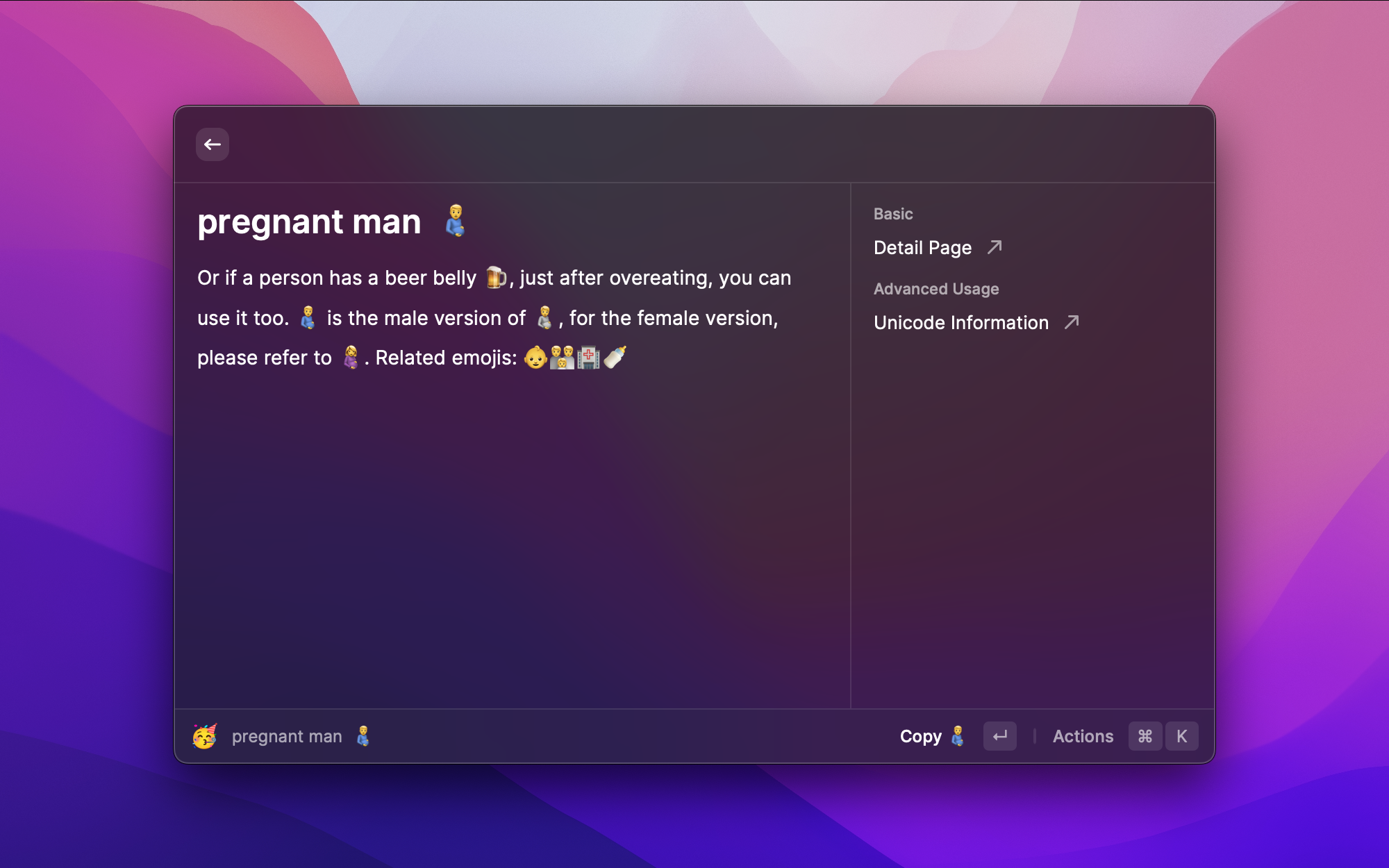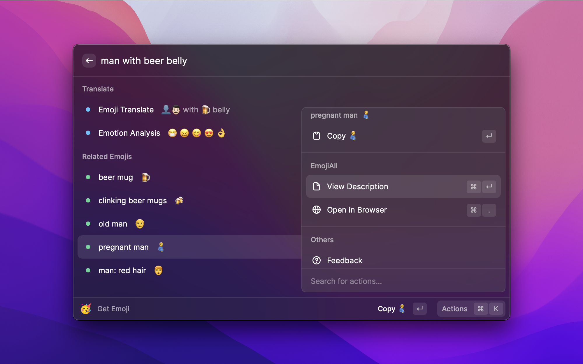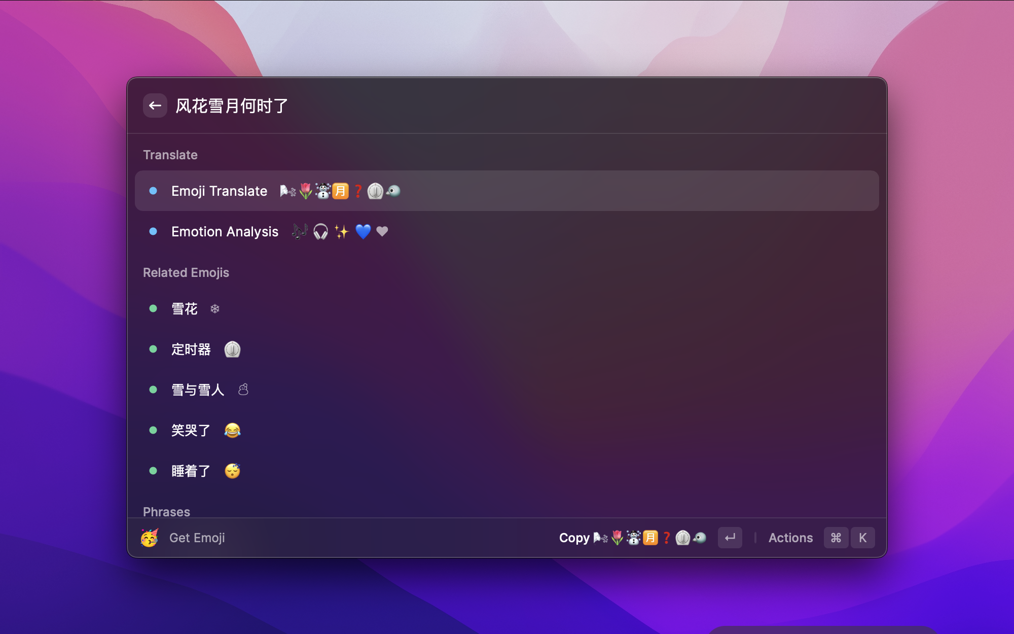 普通的 Emoji 搜索只能按名称匹配,但 DLmoji 用深度学习理解语义。输入"风花雪月何时了"或者 "man with beer belly" 这样的自然语言描述,它能智能推荐相关的 Emoji,支持中英文,还能做情感分析。找 Emoji 不再需要一个个翻了。