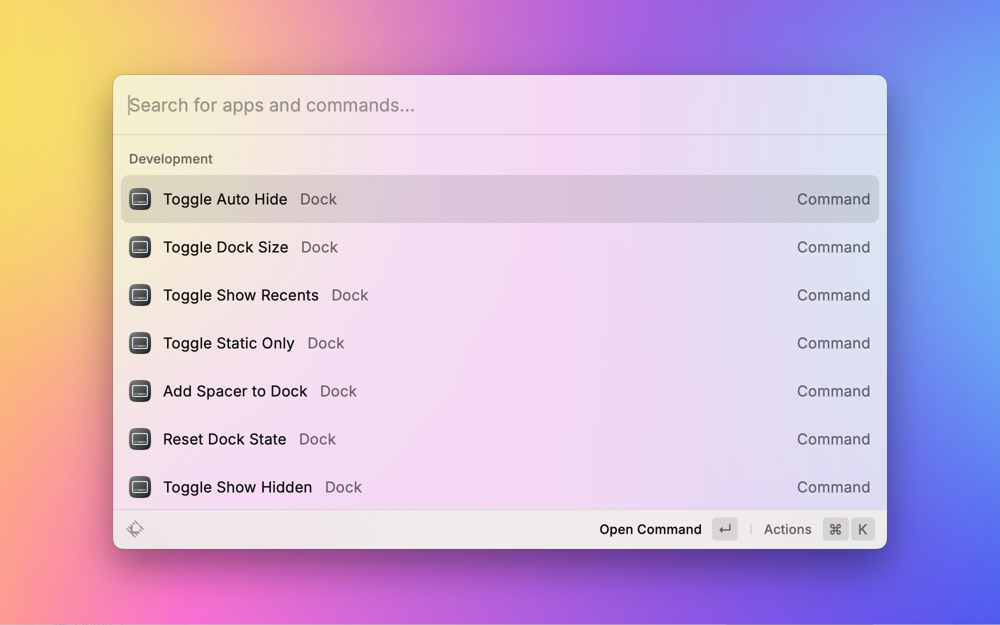 macOS 的 Dock 栏有很多隐藏设置,比如自动隐藏、调整大小、显示最近使用的应用等。Dock Tinker 把这些散落在终端命令里的调整选项集中到了 Raycast,一键 toggle 各种 Dock 行为,不用再记那些 defaults write 命令了。