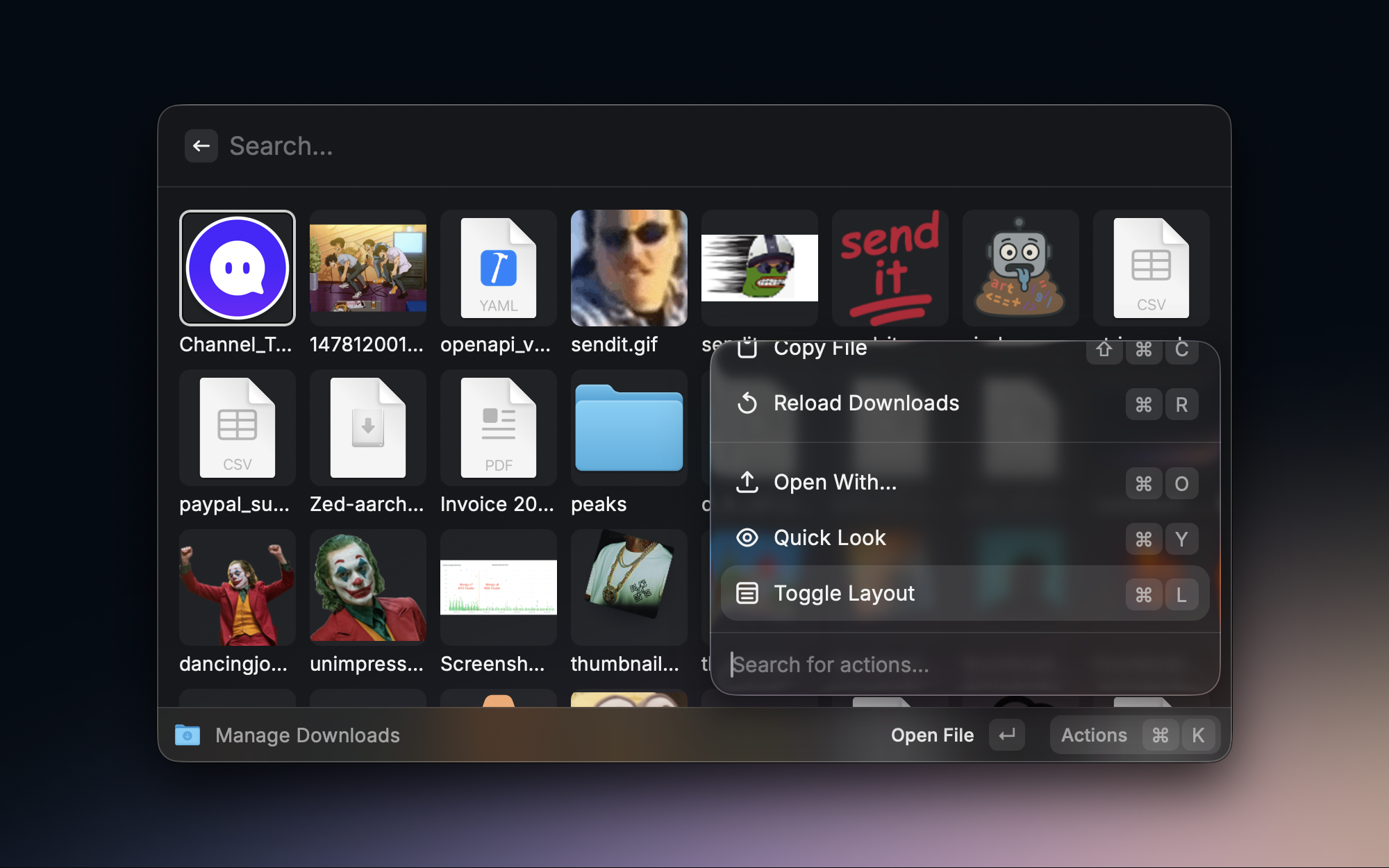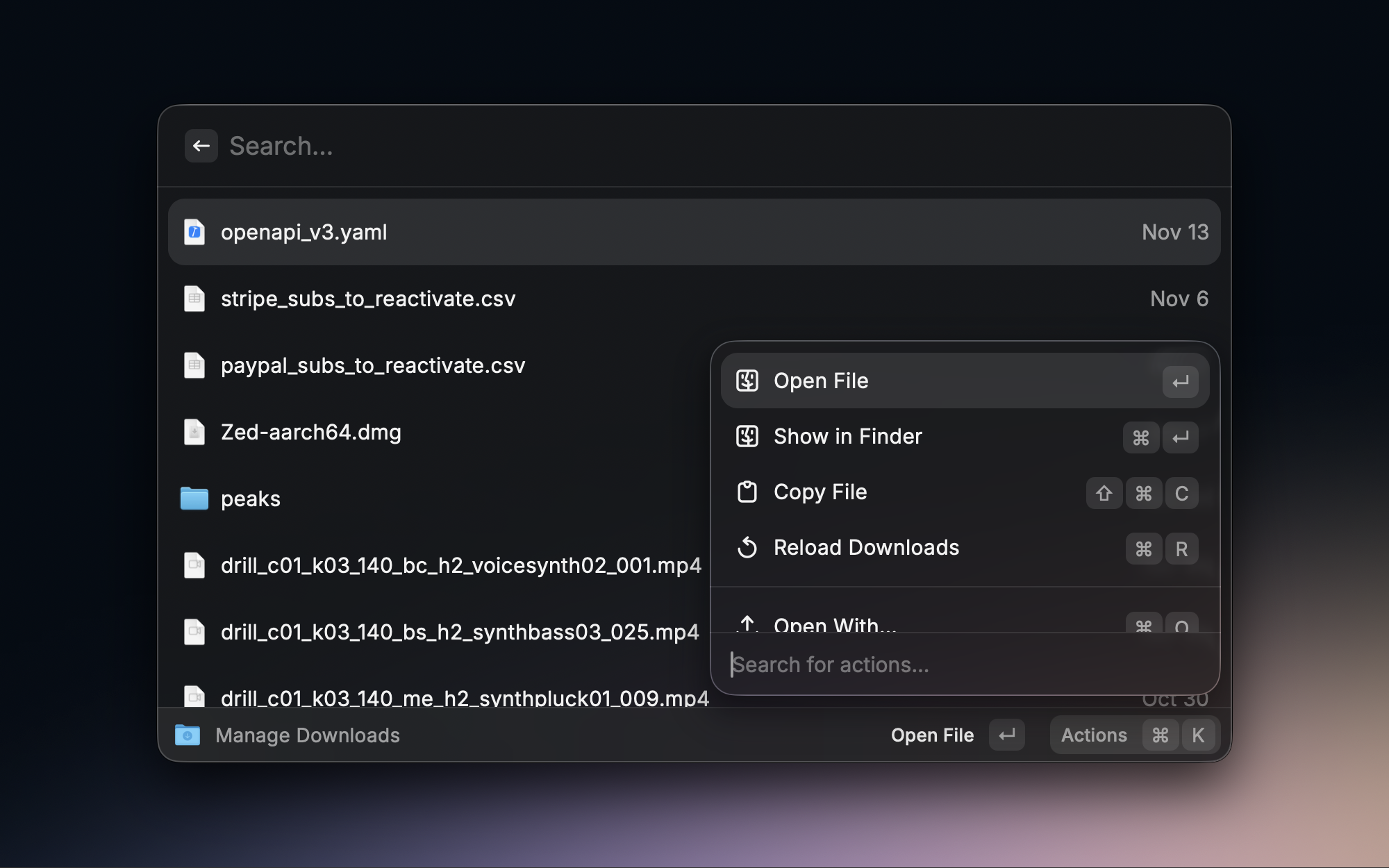 下载文件夹经常堆积了各种文件,找起来很麻烦。Downloads Manager 让我可以在 Raycast 中搜索和管理下载目录的文件,快速找到刚下载的内容,不用再去 Finder 里翻了。