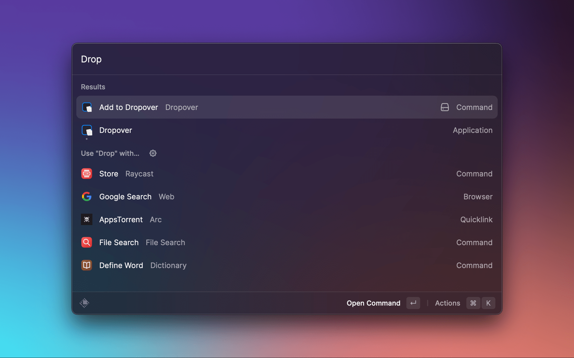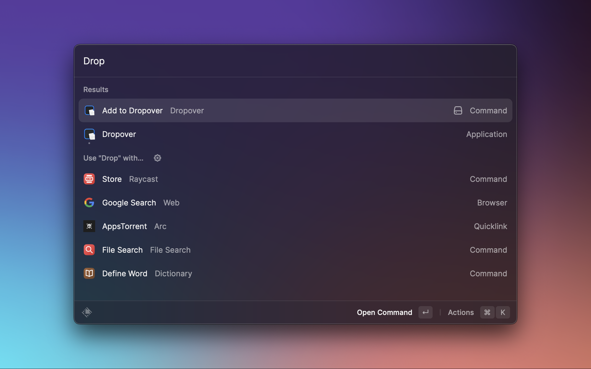 Dropover 本身是一个很好用的文件暂存工具,这个 Raycast 插件让我可以通过命令快速将选中的文件添加到 Dropover 暂存架。搭配 Dropover 使用,跨窗口拖拽文件变得更流畅。