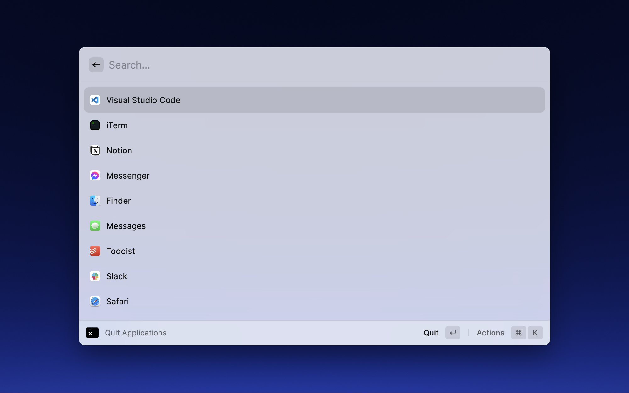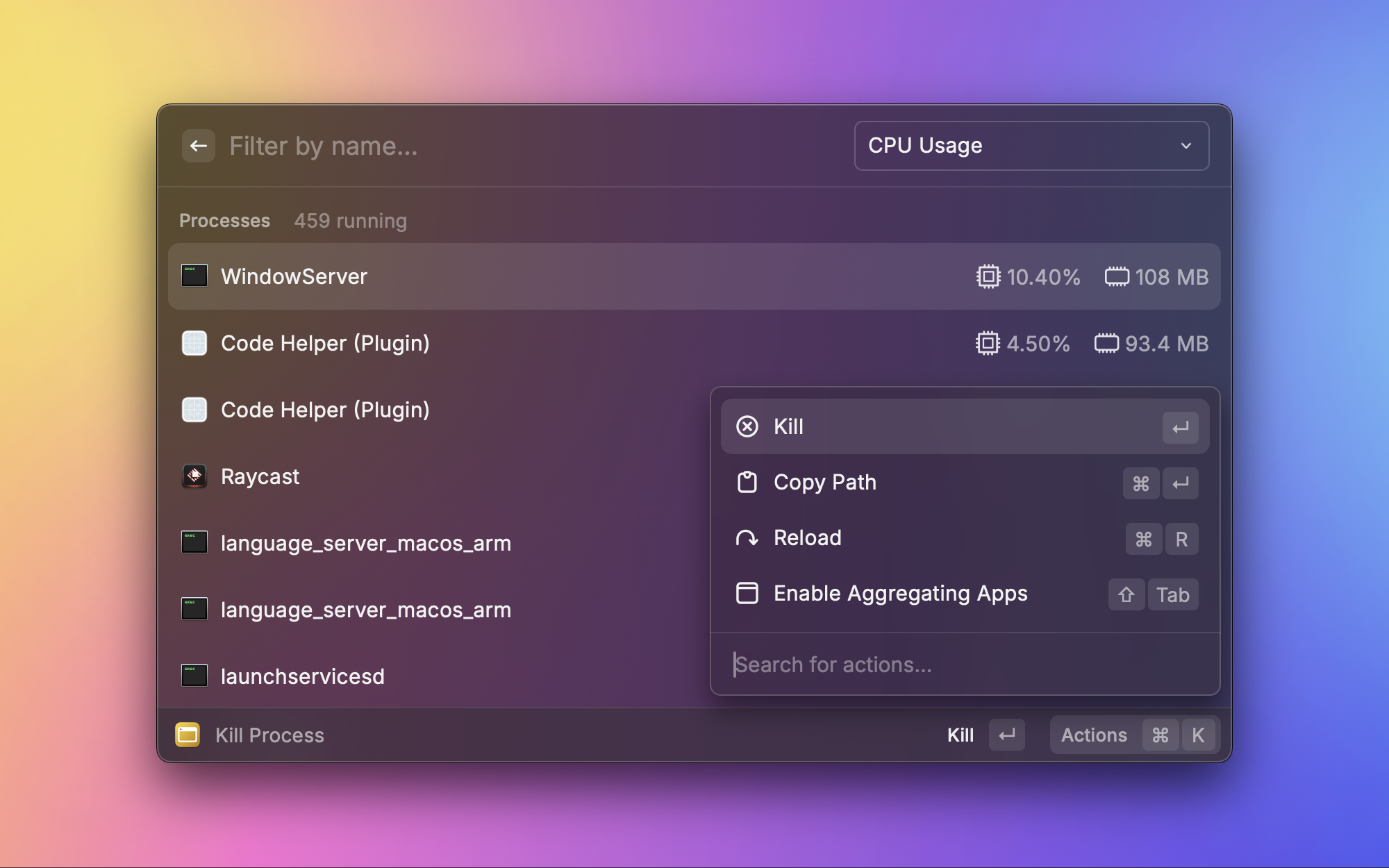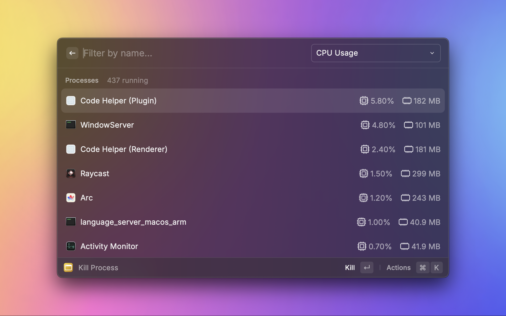 Mac 上关闭窗口不等于退出应用,很多应用关了窗口还在后台跑。这个插件可以直接从 Raycast 批量退出不需要的应用,释放系统资源。特别是内存紧张的时候,快速清理一下后台应用很有用。