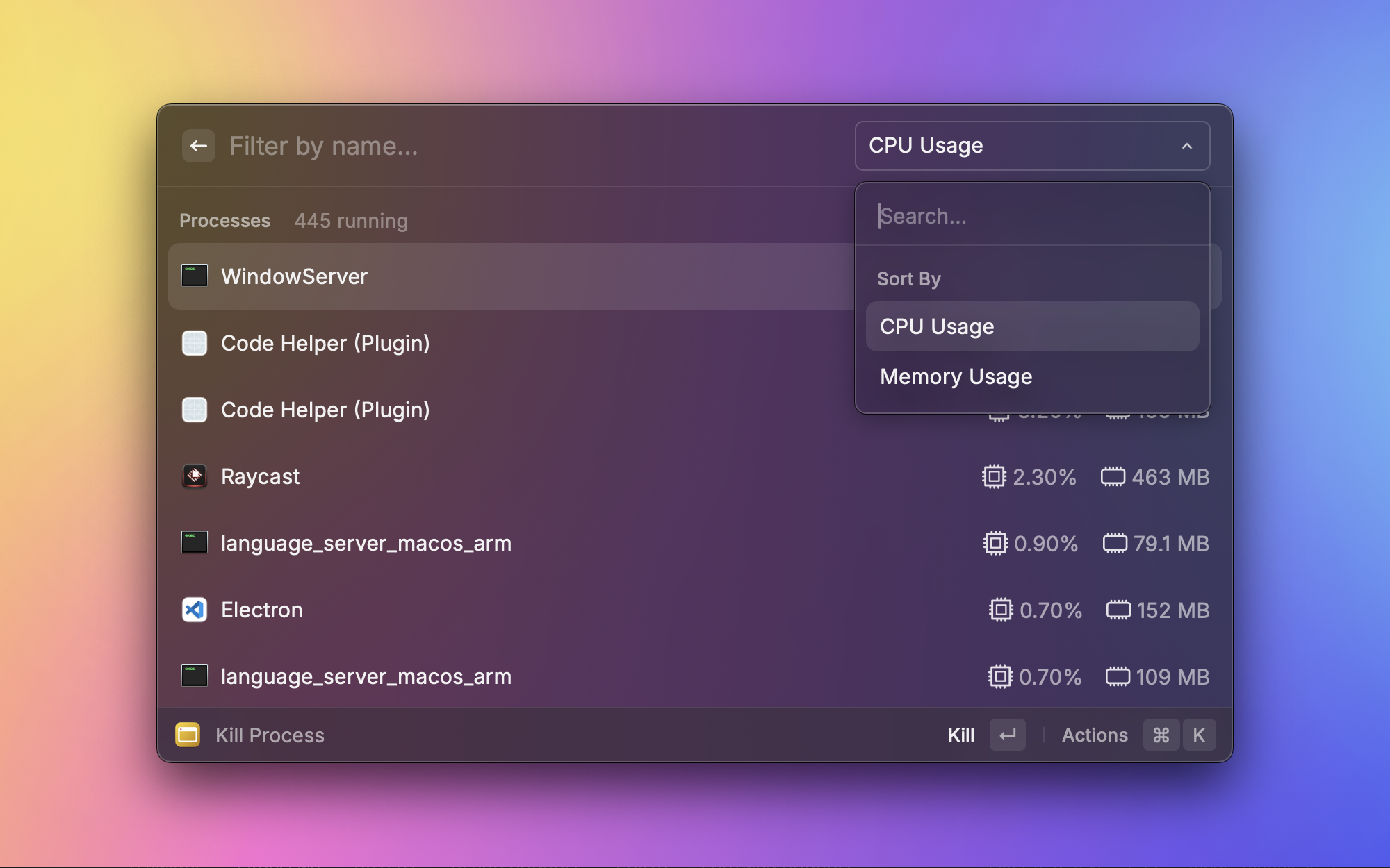 Mac 上偶尔会有进程卡死或者吃满内存的情况。Kill Process 按 CPU 或内存占用排序列出所有进程,找到问题进程一键终止。比打开活动监视器再找进程要快得多,是处理系统卡顿时的第一反应工具。