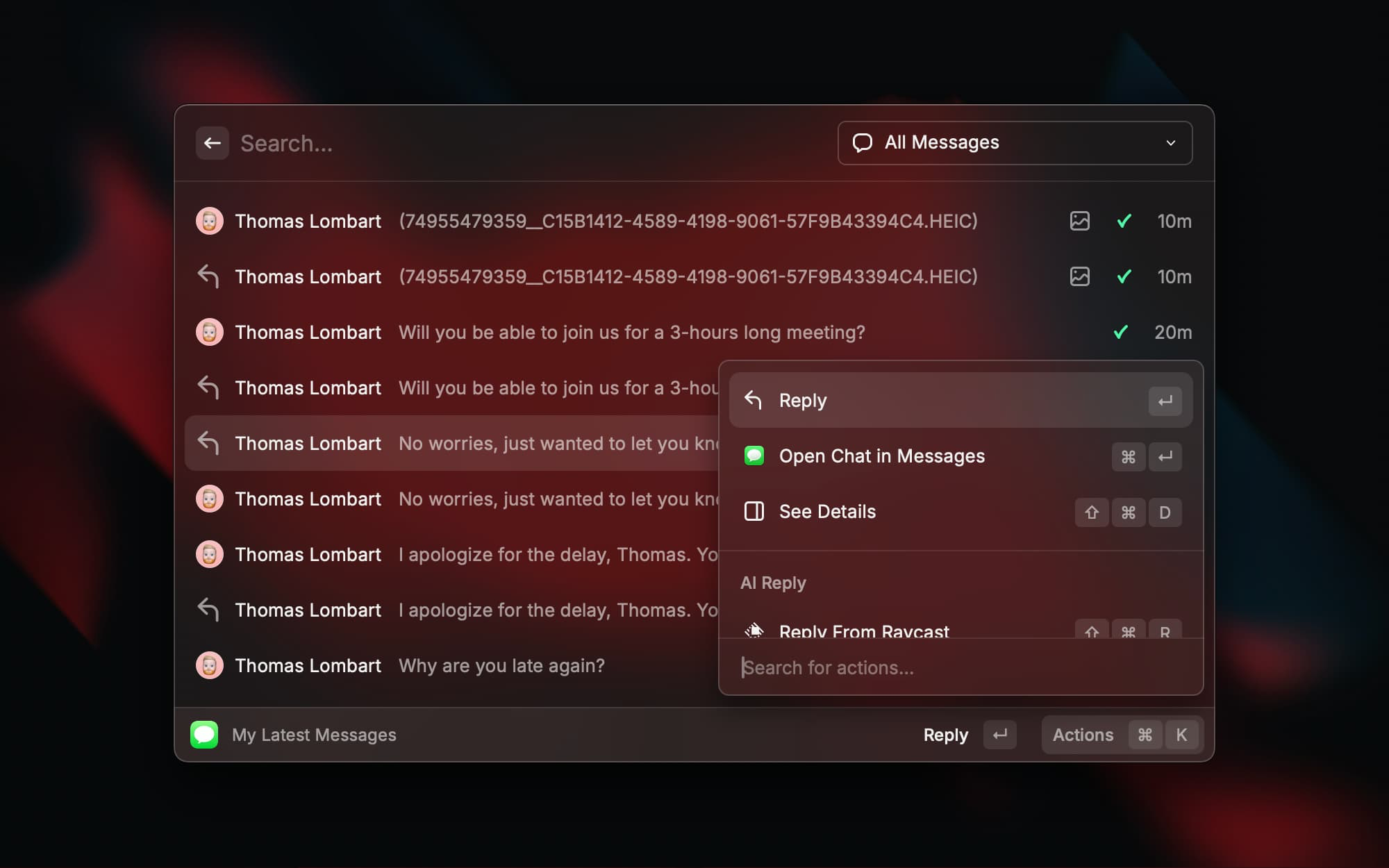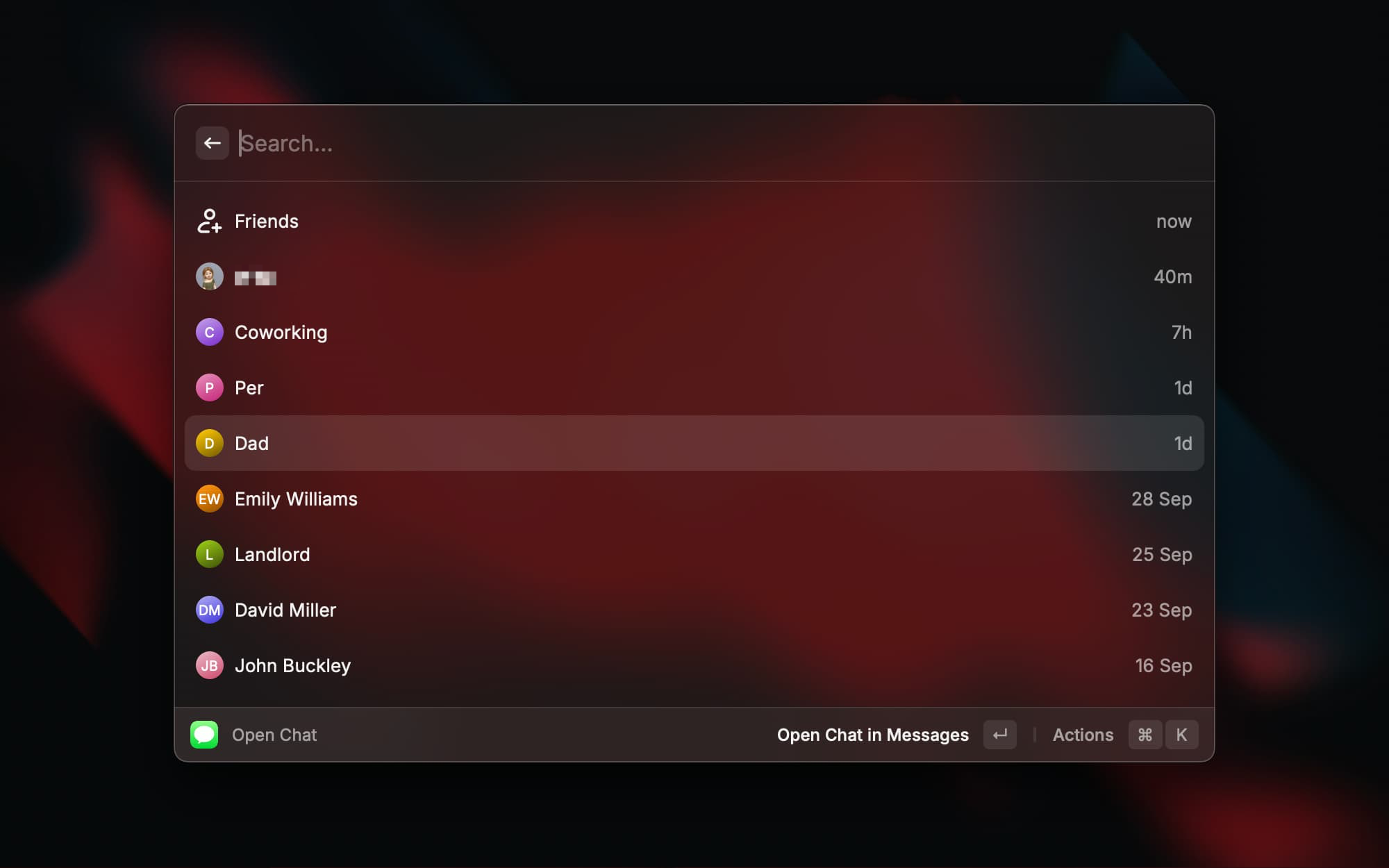 不用切换到信息应用就能快速查看最新 iMessage 消息、搜索联系人并打开对话。适合专注工作时快速回复消息,不用被打断当前的工作流。