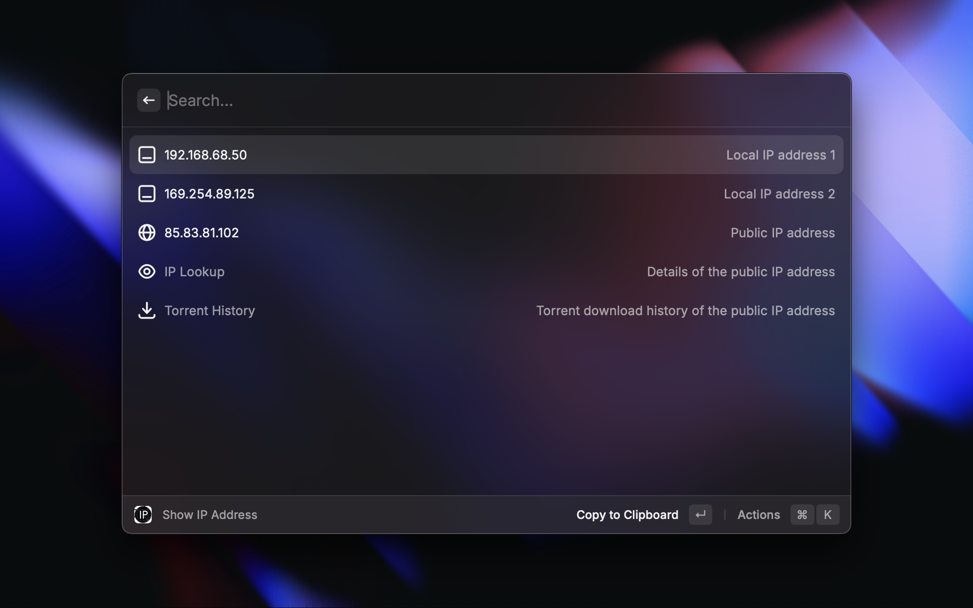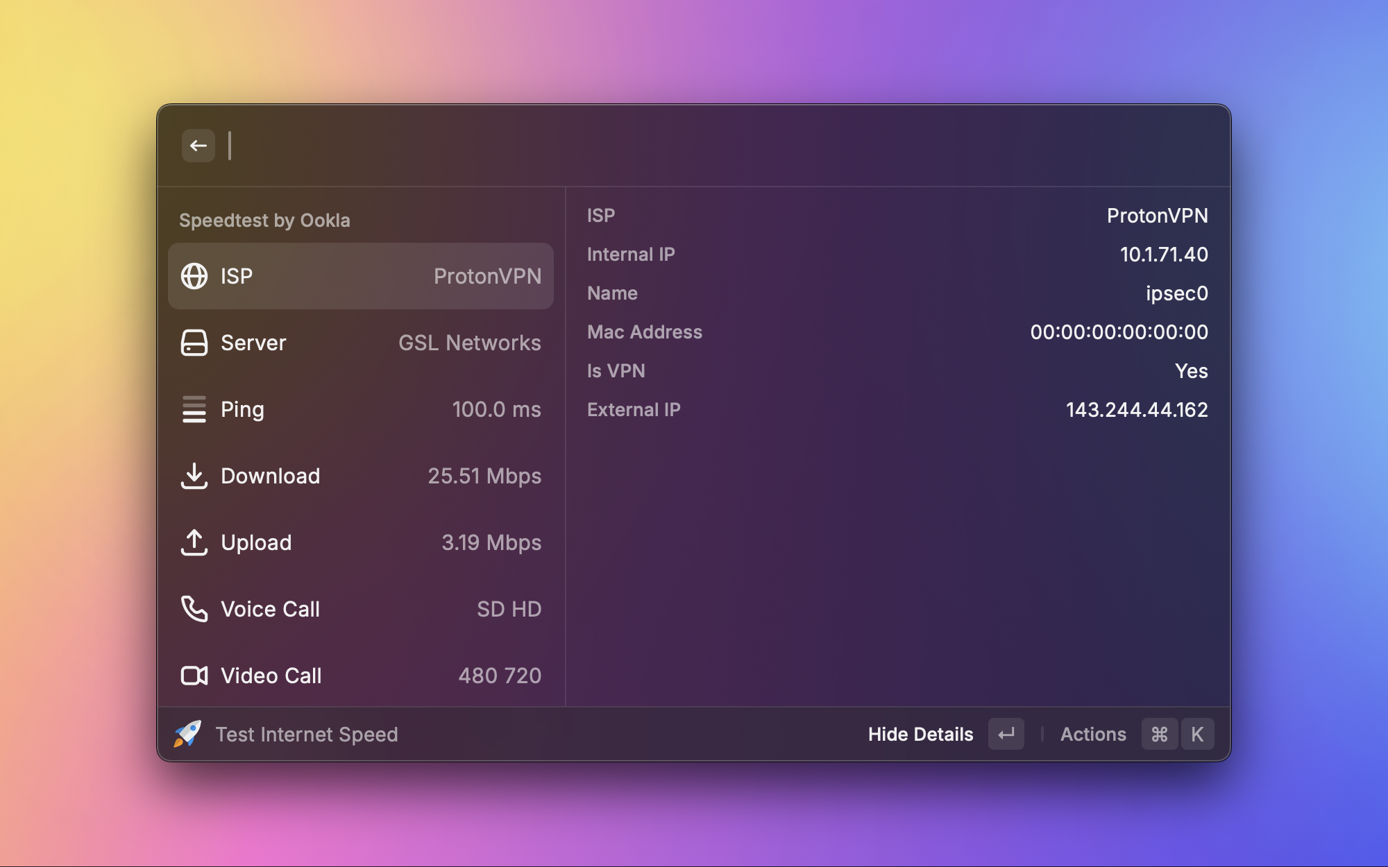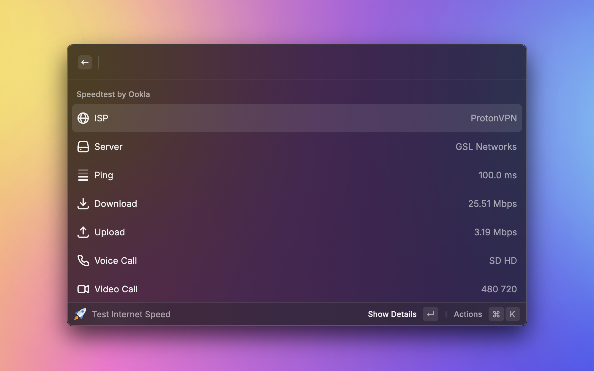 网络好像变慢了?不用打开浏览器去 speedtest.net,直接在 Raycast 里一键测速。上传、下载速度和延迟一目了然,测完还能把结果复制分享。排查网络问题的时候,这是最快的方式。