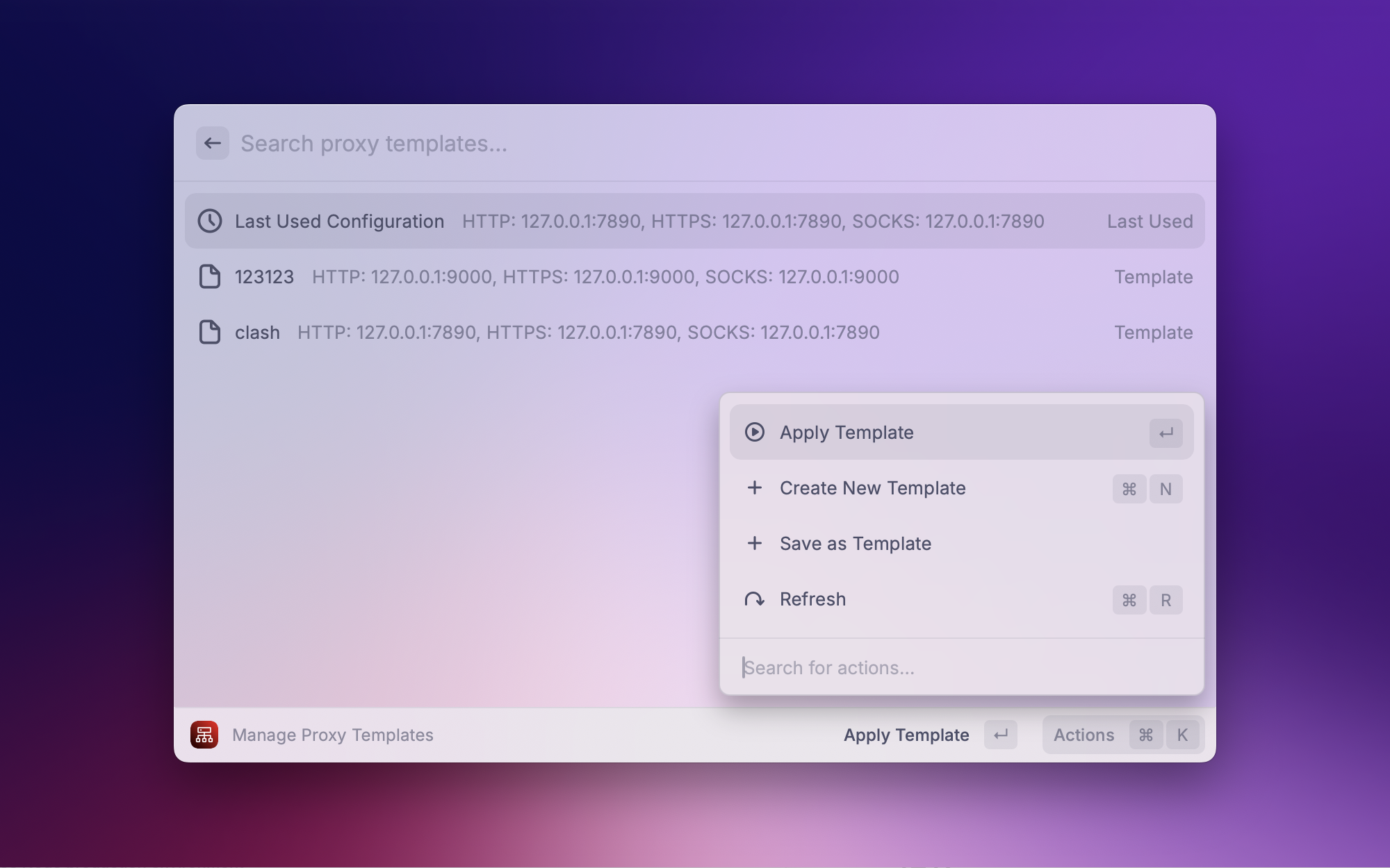 这是我自己开发的插件。在不同网络环境下需要频繁切换代理配置——公司内网用一套、家里用另一套。这个插件支持代理模板管理,保存多套配置方案一键切换,还能快速查看当前的代理状态,不用每次都去系统设置里改。