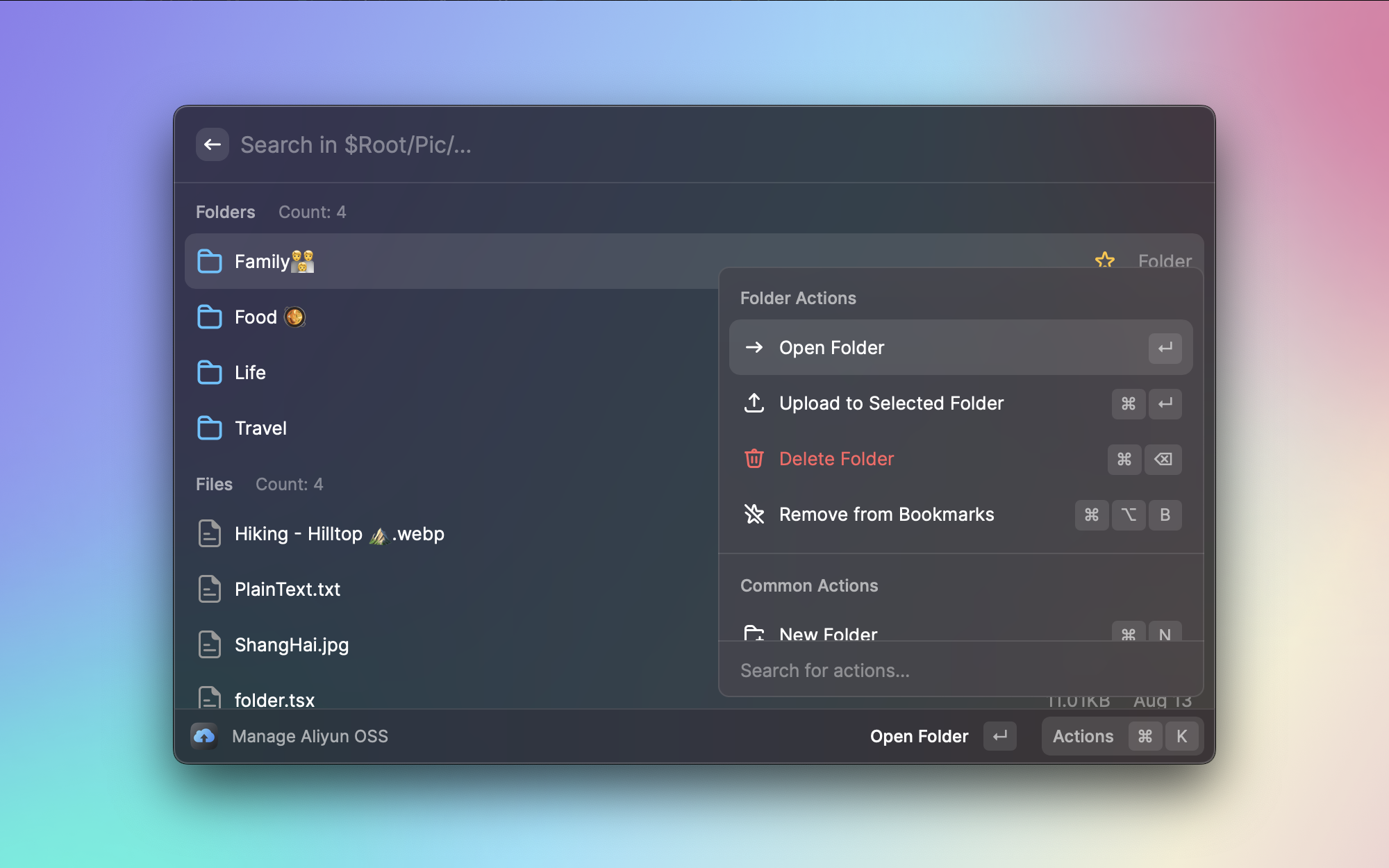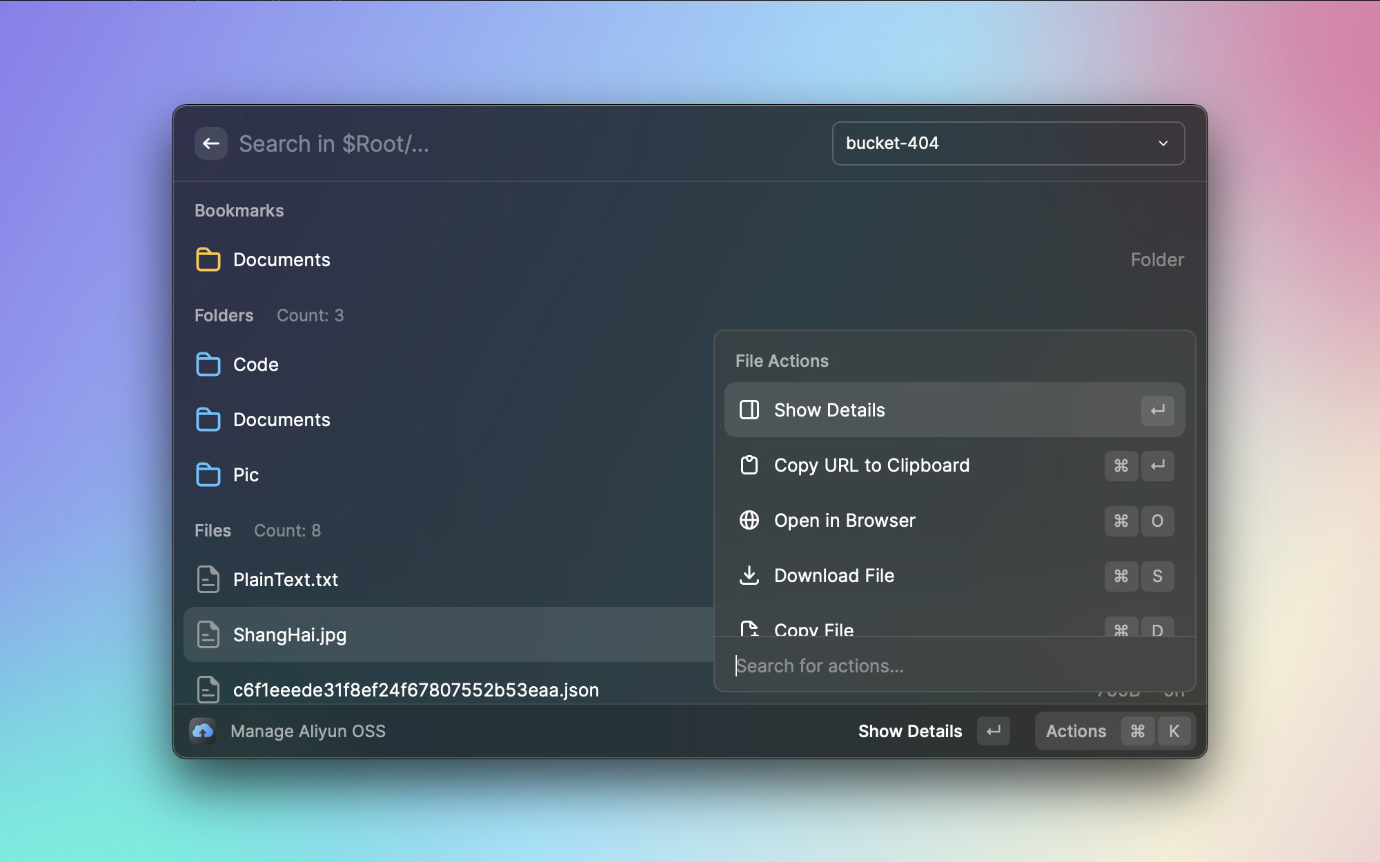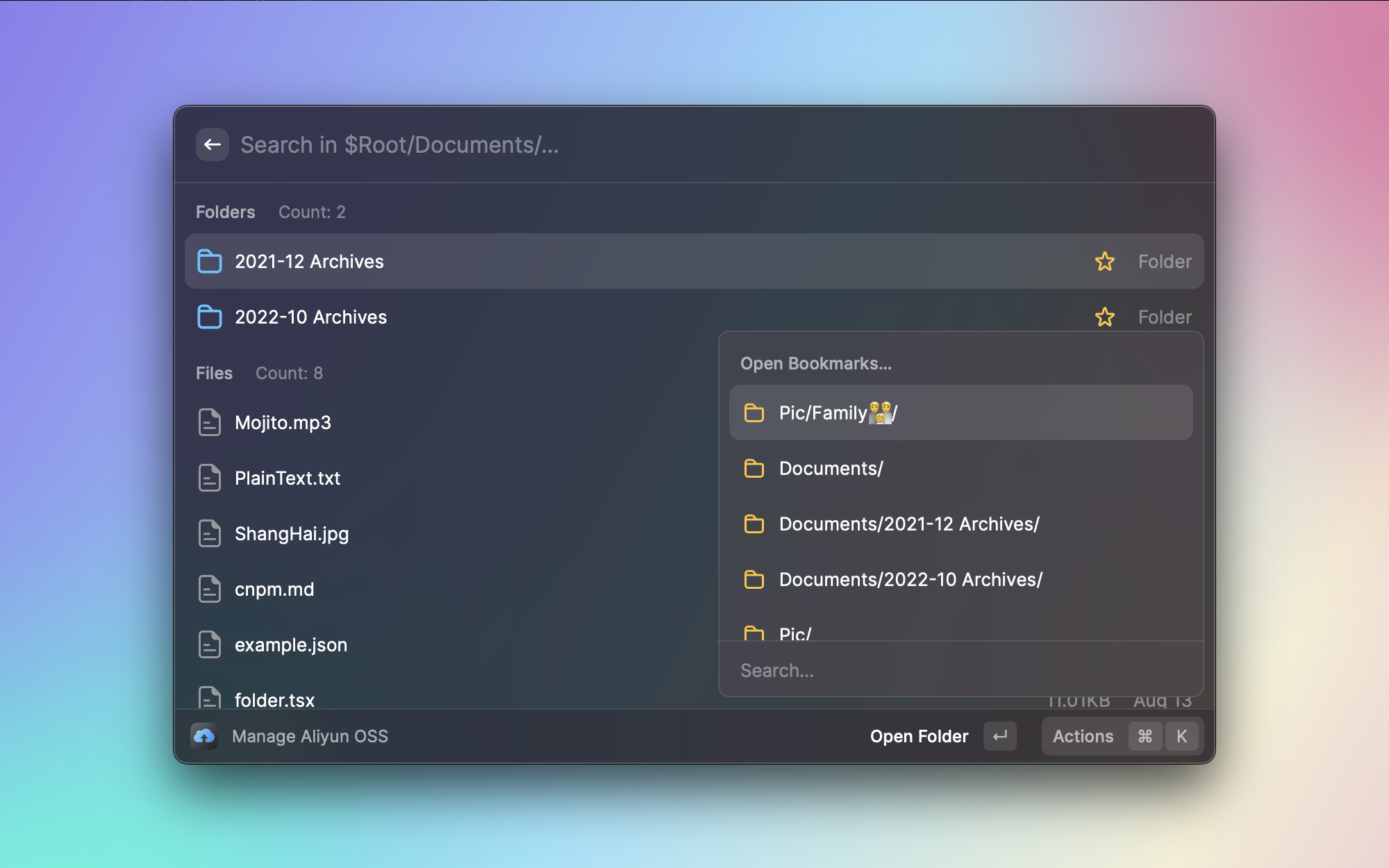 写博客的时候经常需要上传图片到阿里云 OSS。OSS Browser 可以直接在 Raycast 中浏览存储桶的文件结构,还支持书签功能快速跳转到常用目录。不用再打开网页版的 OSS 控制台,管理云端文件变得更顺手了。