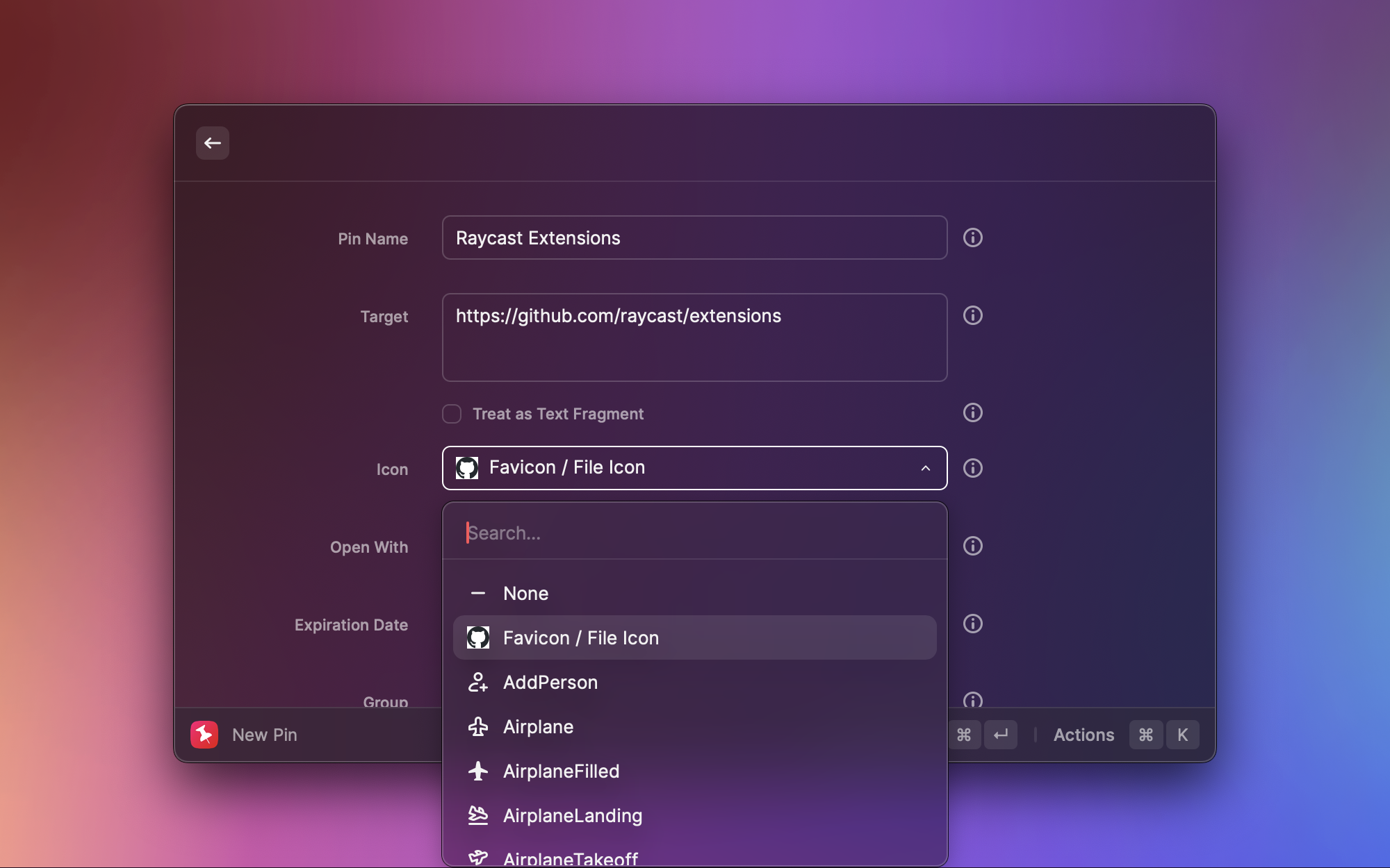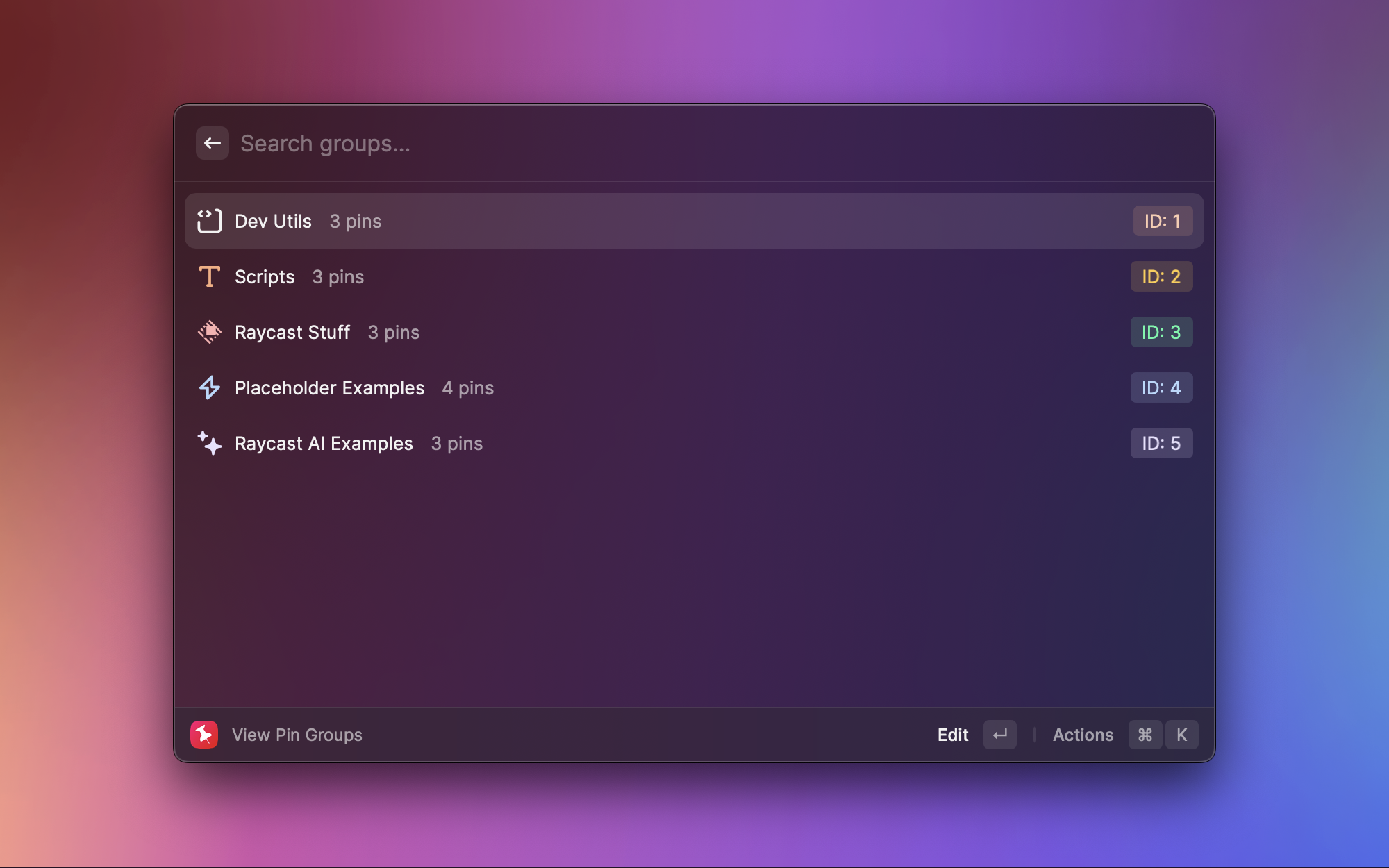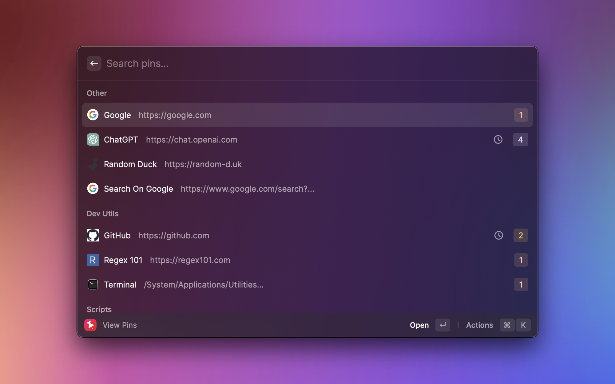 把常用的网址、文件路径、甚至终端命令固定到 Raycast 中,按分组整理。比如我把 GitHub、Regex101 这些常用开发工具网址都钉在这里,需要的时候搜索 pin 就能一键打开,比浏览器书签栏更方便。