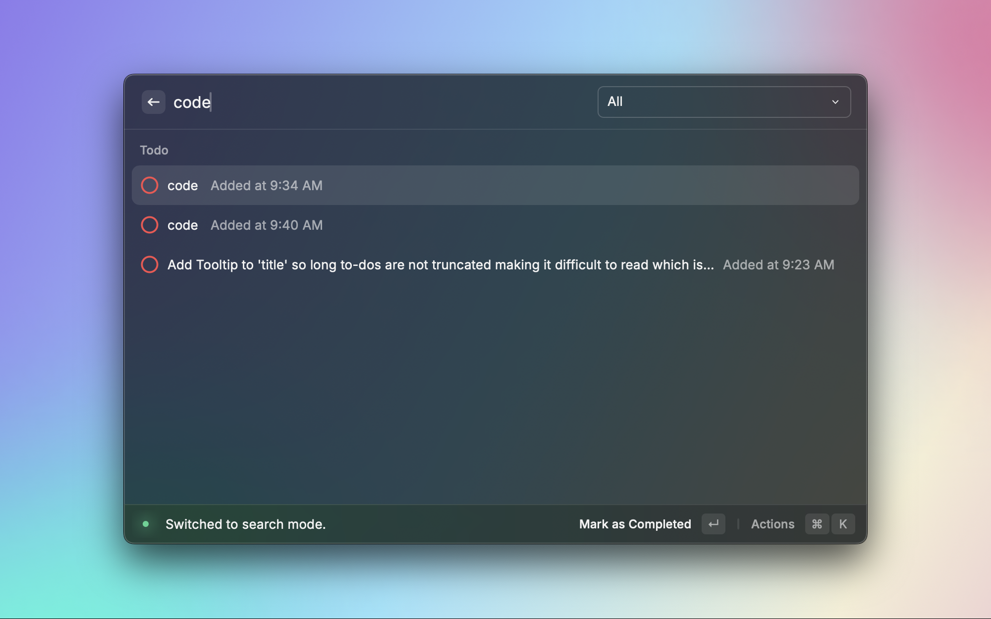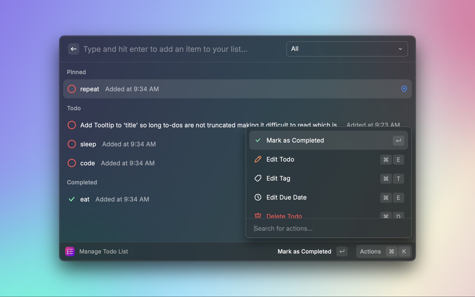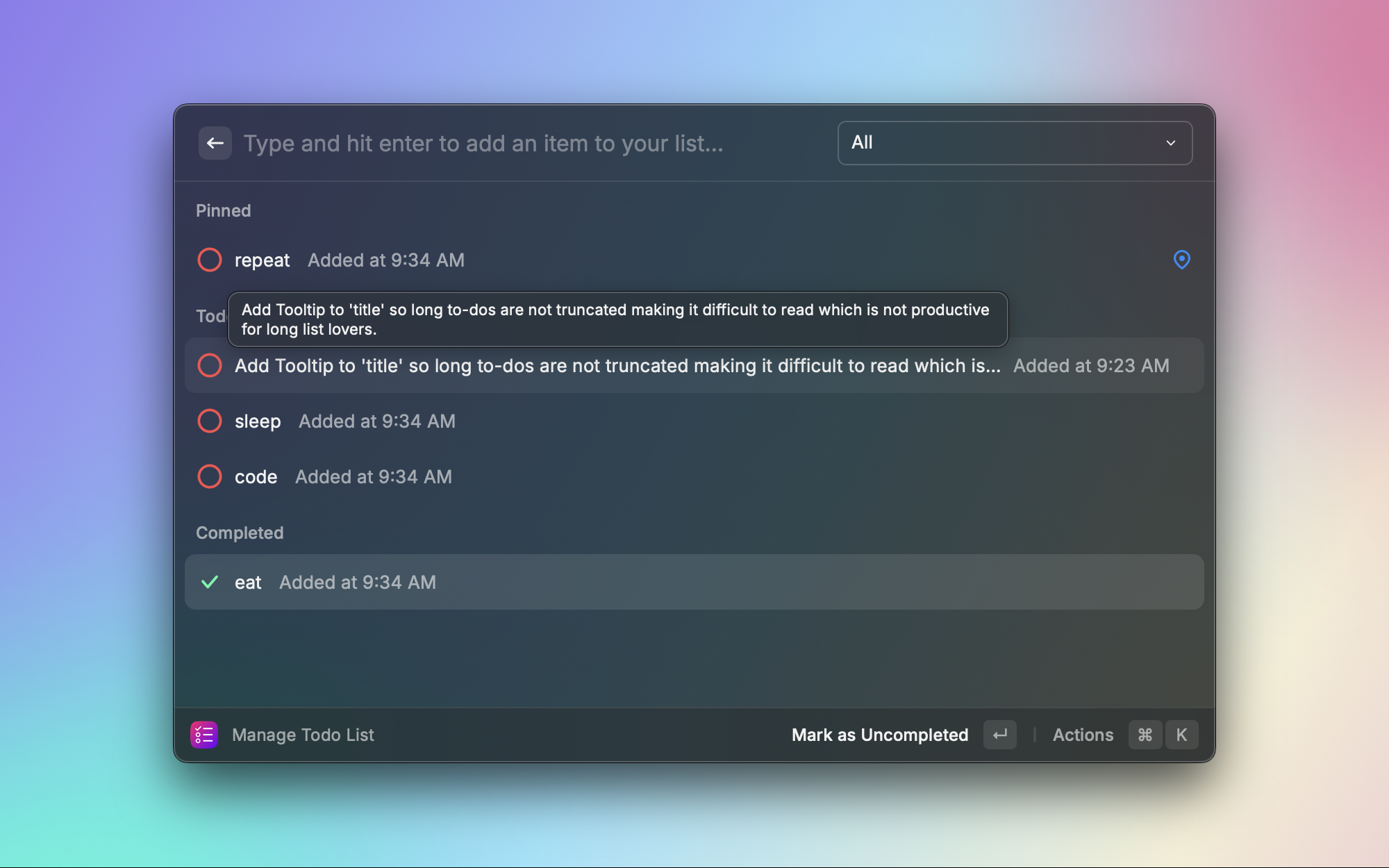 不需要复杂的任务管理工具,有时候只是想快速记下几件要做的事。Todo List 提供了一个极简的待办清单,直接在 Raycast 中添加、勾选和删除任务。轻量、快速,适合管理短期的临时任务。