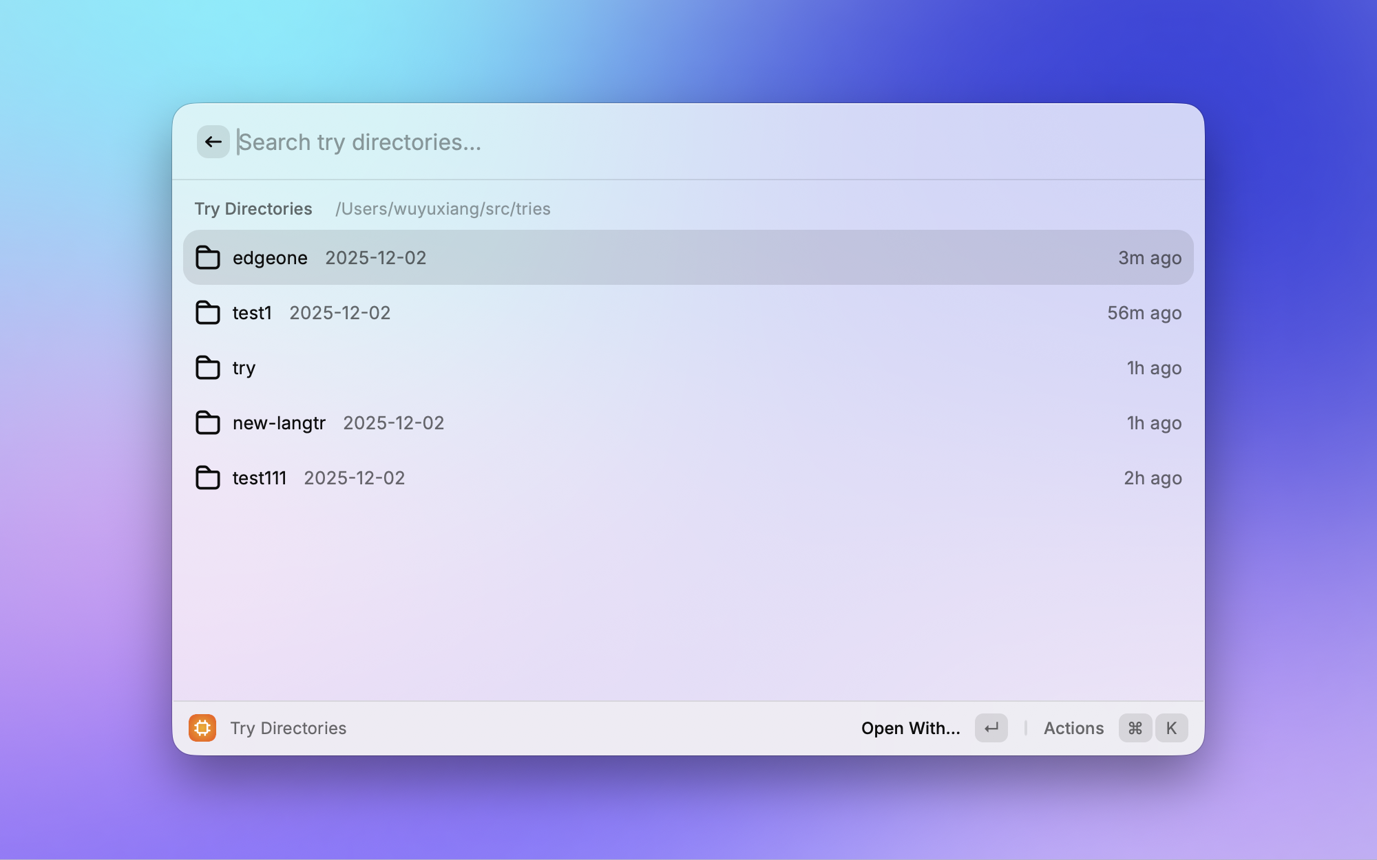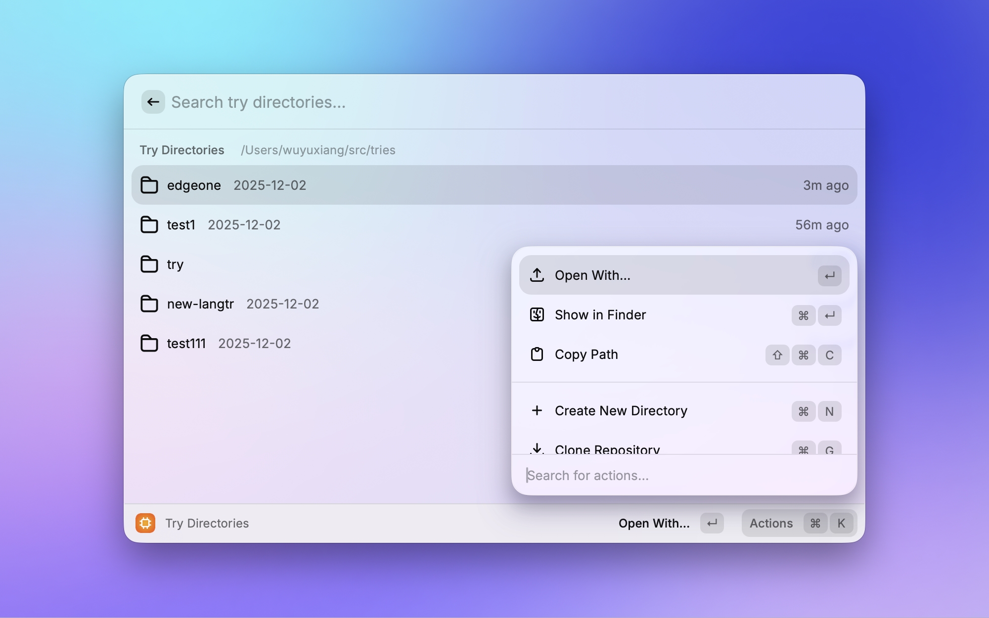 这也是我自己开发的插件。平时经常需要创建临时目录来试验新技术、clone 一个 repo 看看,但这些实验目录散落在各处很难管理。Try 统一管理 ~/tries 下的实验工作区,可以快速创建新目录、用编辑器打开、在 Finder 中显示,还能一键 clone 仓库到实验目录。