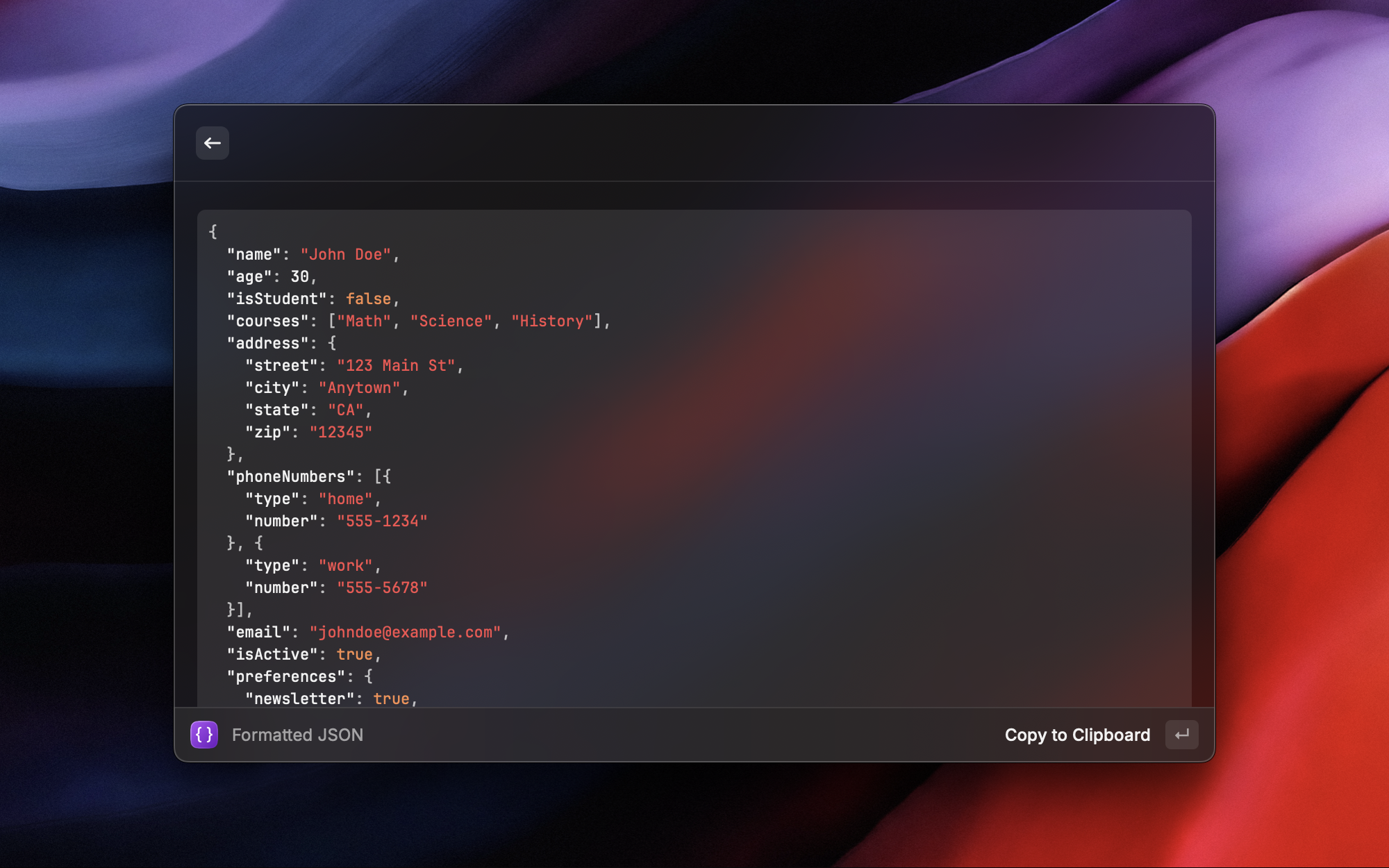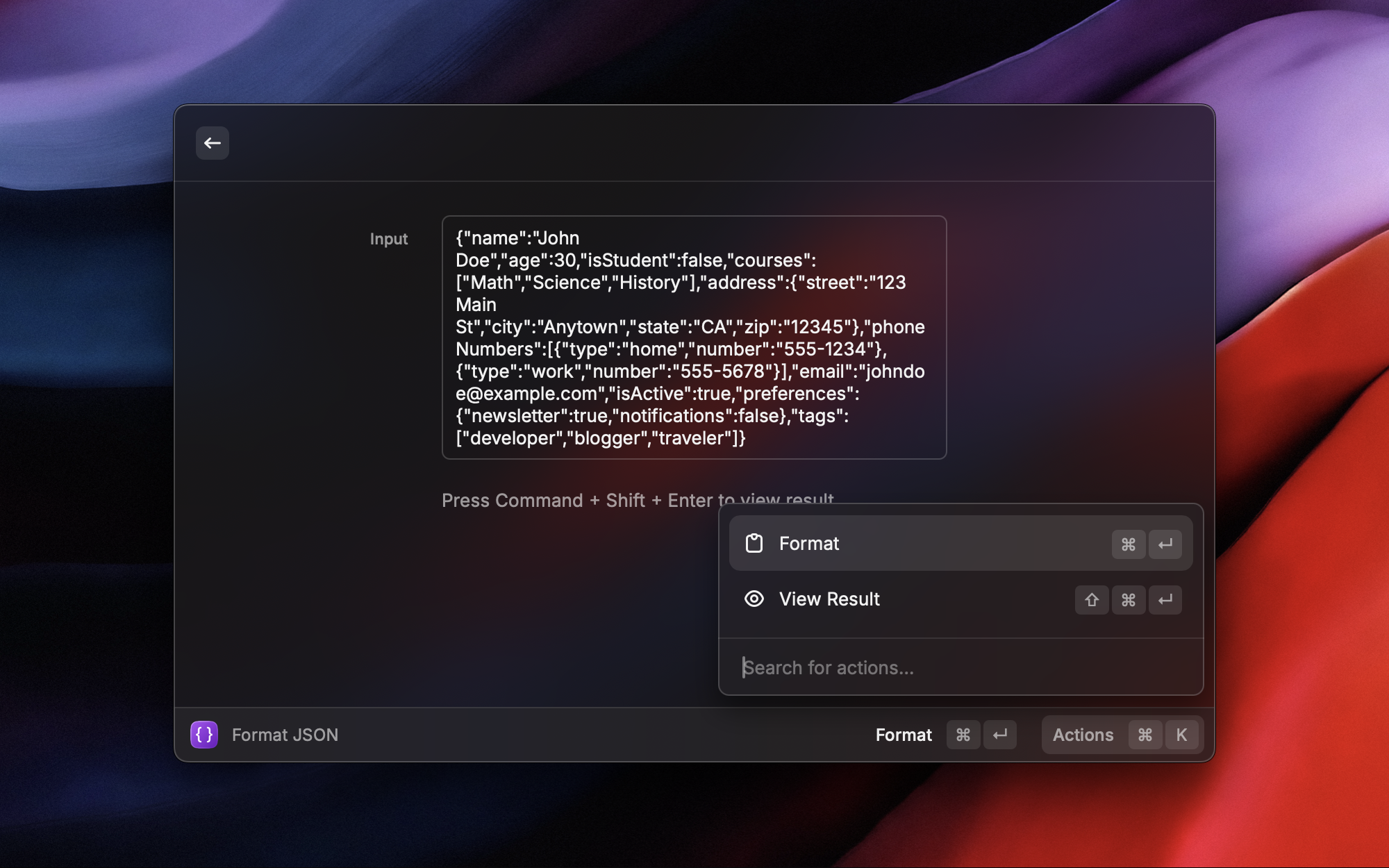 开发过程中经常需要处理 JSON 数据——API 响应、日志、配置文件。Format JSON 让这件事变得极其简单:复制 JSON 到剪贴板,呼出 Raycast,格式化后的结果直接替换剪贴板内容。